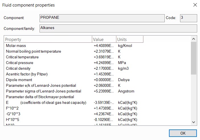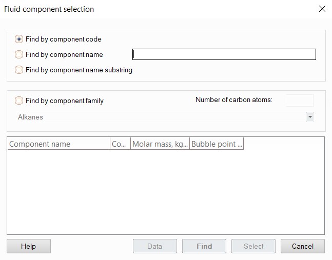 To add a found component, select it in the list of found substances and click the "Select" button (or simply double-click the left mouse button on the substance name in the list). After selecting a component, its code will be displayed in the corresponding field, which, if necessary, allows you then to switch the method for calculating fluid properties to some other library without re-entering the components (of course, only if this library contains all the components entered). The full list of substances and fluids available in the "STARS" library can be found here.