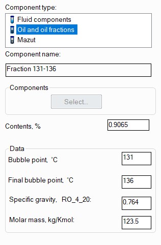 Oil fractions can be used not only for modeling oil distillation. They are often used to model various types of oils, "crude" oil (for which the fractional composition is unknown) and other media, specifying them as fractions with a very wide boiling range. However, it is important to understand that this method of setting can only give a very rough estimate of the thermophysical properties of the fluid (and even more so, the fluid should not be modeled this way if it is necessary to calculate not only the properties, but also phase equilibria). And the calculation error will be greater, the greater the difference between the temperature of the beginning and end of the boiling of the fraction. Therefore, fractions with a wide boiling range should be used only in cases where there are no other options for modeling a given fluid.