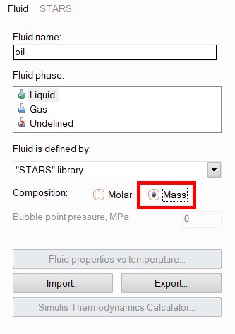 When modeling a fluid using the STARS library, it is necessary to enter its molar or mass (which is indicated using the corresponding switch in the Object Properties Window) component composition.