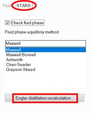 If the Engler distillation parameters are known for oil, such oil can be modeled in the Hydrosystem using the STARS library. To do this, select the fluid in the project tree, select the mass units of the composition in the Object Properties Window, then go to the STARS tab and click the "Engler distillation recalculation..." button there: