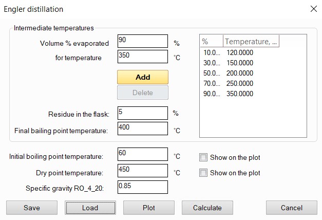 The Initial boiling point temperature, Dry point temperature and Specific gravity RO_4_20 (the ratio of oil density at 20 °C to water density at 4 °C) fields must be filled in. For a clearer representation of the Engler distillation curve, the initial boiling point and dry point temperature can be plotted on the graph by checking the Show on plot boxes opposite the corresponding fields. These points can be changed, and the graph will change accordingly.