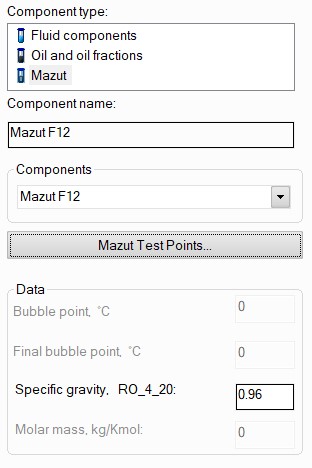 To model mazuts using the STARS library, it is necessary to select the "Mazut" component type, and then specify the mazut type and its specific gravity Ro_4_20 (the ratio of the mazut density at a temperature of 20°C to the density of water at 4°C) in the corresponding fields.