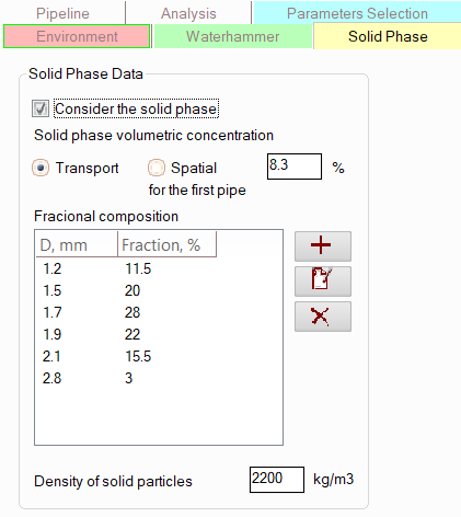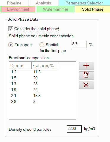 fractional or granulometric composition of the solid phase - here the table of distribution of solid particles by diameters is set. To add, edit and delete points of the fractional composition table use the corresponding buttons to the right of the table. If the granulometric composition of the solid phase is unknown, it is allowed to set only one point in the table, for which the average particle diameter (or maximum, depending on the case to be modeled) and the fraction of 100% should be indicated. But in this case the calculation accuracy may be not that high as in case of calculation with specified particles size distribution;
