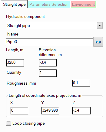roughness of the inner surface of the pipe - initially this parameter is set for the pipeline and/or its branches, therefore, by default, the same roughness value will be set for the section and used in the calculation as in the branch to which it belongs. However, if necessary, different roughness values can be set for different sections of the branches (for example, if part of the pipeline is "old", part is "new" or if the pipeline consists of pipes of different materials, etc.);