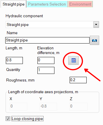 loop closing pipe - this option is used when modeling pipelines with closed loops. Any one of the pipes of the closed loop can be assigned as a loop closing pipe by enabling this option for it. In this case, entering the projection lengths for this section is blocked, and the program calculates what the projections of this pipe should be so that the loop closes perfectly (the loop closing pipe is shown in the isometric piping diagram as a pale gray line). To then "accept" the projection lengths calculated by the program and determine the length and elevation difference of the pipe, click the "Recalc by graphics" button (in the form of a blue "calculator") for this pipe: