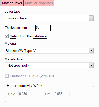 Here you need to specify the layer type (thermal insulation or cover layer), select the material from the list and specify its thickness. Please note that: