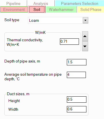 depth of pipe axis and the average soil temperature on pipe depth - please note that if the upper part of the pipeline (for buried pipelines without duct) or the upper part of the duct ceiling (for pipelines in ducts) is buried less than 0.7 meters, then in accordance with the recommendations of SNiP 41-03-2003, the ambient temperature in the calculation will not be the soil temperature, but the corresponding outside air temperature;