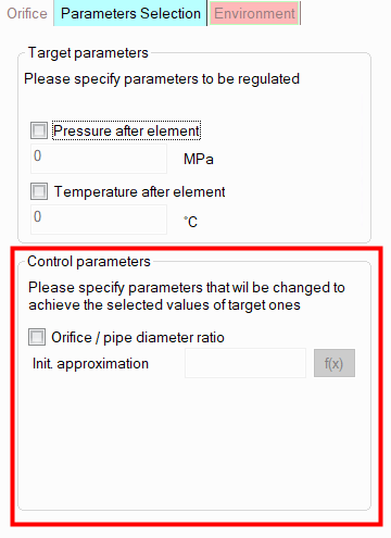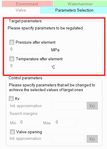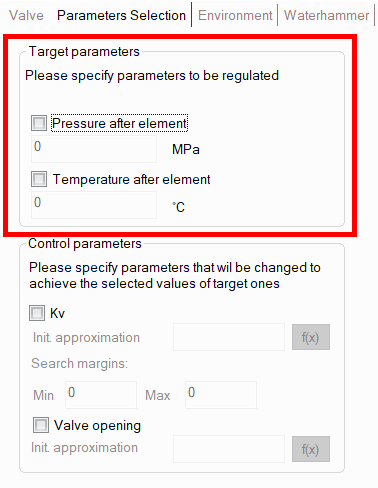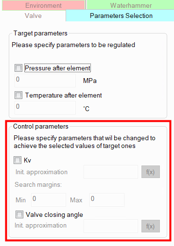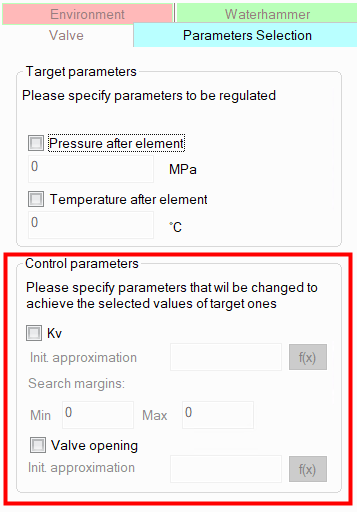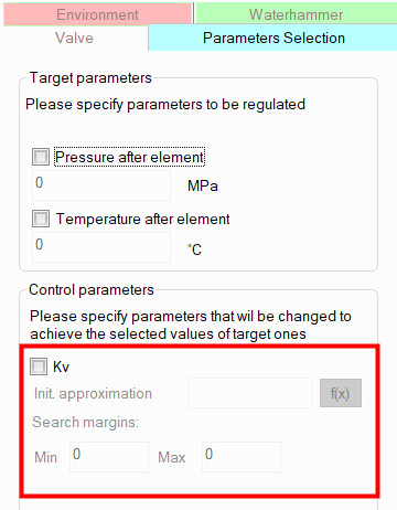 On this tab, you need to check the box next to the parameter that is the controlling one (the value of which you need to calculate) and enter its initial approximation (in the case of Kv, you also need to enter the search margins in which the program will search for a solution). Usually, the default initial approximations and search boundaries allow to find a solution in most cases. However, in some rare cases it may be necessary to adjust the initial approximation and/or search boundaries (for example, if the solution lies in the area of very small or, conversely, very large values of the control parameter), if the calculation with the default initial approximation and search boundaries does not converge or takes a long time.