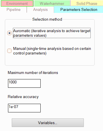 Also in the parameters selection settings you can switch between the “traditional” automatic selection of parameters and the so-called “manual”, in which, in fact, the selection of parameters is not carried out, but a one-time calculation of the pipeline is performed with the values of the control parameters that are specified for the piping components on the “Parameters Selection” tab. This type of calculation is useful because it allows to set the values of the control parameters by using the variables that can be set by clicking the corresponding button below: