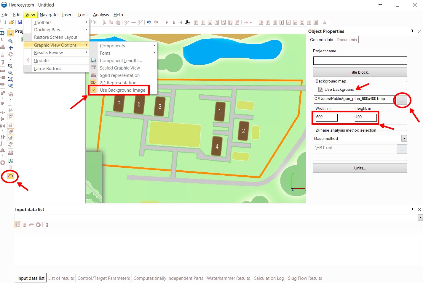 Building a pipeline model on a background is in many ways similar to "regular" pipeline modeling (it is necessary to add branches, pipe sections, valves, fittings, etc. to the pipeline in the same way), except that in this mode you can move pipeline nodes in the graphic window (by selecting a node on the diagram and moving the cursor while holding down the left mouse button), thereby "pulling" the pipe sections between them. The program will calculate the lengths of the pipe section projections (as well as the parameters of the adjacent branches) automatically, based on the specified scale of the background. Therefore, when working with the background, be sure that the "Scaled graphic view" of the pipeline is enabled in the graphics parameters and that the width and height of the background are set correctly (otherwise it will be impossible to correctly calculate the lengths of the pipe sections, as a result of which the use of the 2D mode loses its meaning).