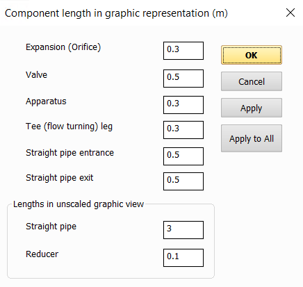 When you click the "Apply" button in this window, these dimensions will be applied to all pipeline elements except those for which these dimensions were changed manually (using the "Stretch" command), when you click the "Apply for All" button - to all elements of this type without exception (including those for which the dimensions were changed individually). If you simply click the "OK" button without clicking the "Apply" or "Apply for All" buttons beforehand, these changes will not affect existing pipeline elements, but all newly added elements will have the specified lengths by default.