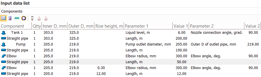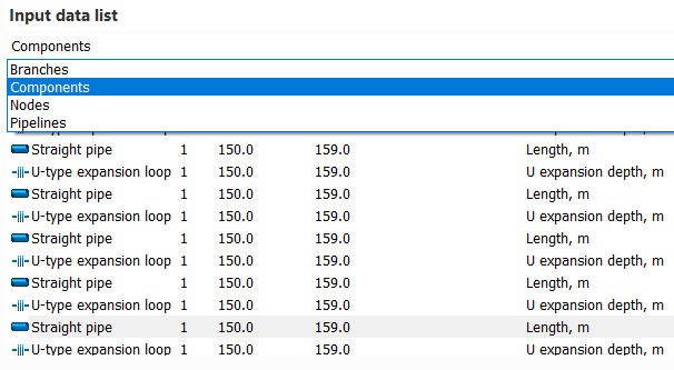 At the top of the input data list window there is a drop-down list that can be used to switch between the presentation of input data for pipelines, their branches, piping components, and pipeline nodes (if one of these elements is currently selected):