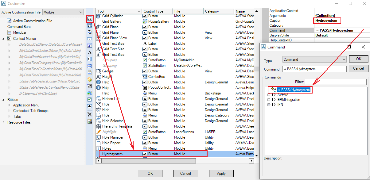 Сreate a button and bind to it the command to open the AVEVA-Hydrosystem module window: