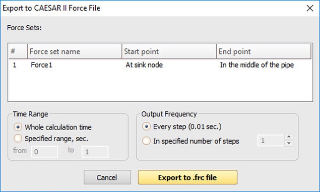 In the export settings, you can specify the time range for which the forces should be exported and the output step. When you click the “Export to .frc file” button, the program will generate a CAESAR II forces file.