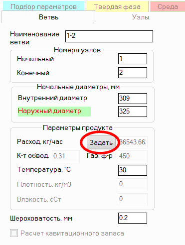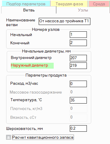 расчет кавитационного запаса - по умолчанию расчет кавитационного запаса в трубопроводе не производится, поэтому пользователь сам должен "отметить" те ветви, для которых требуется рассчитать кавитационный запас, включив для этих ветвей данную опцию.