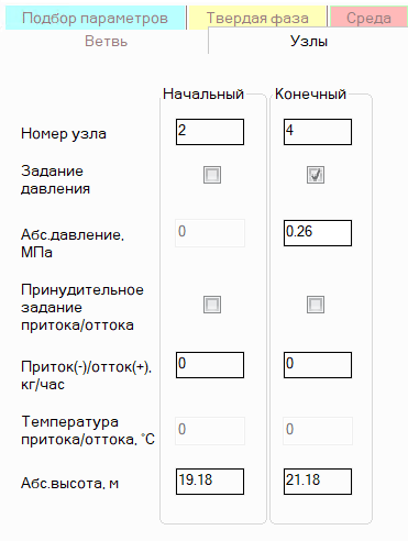 давления в узлах - в зависимости от постановки решаемой задачи гидравлического расчета величина давления в узле может быть как известной - в этом случае она задается, так и неизвестной искомой величиной - в этом случае ее не задают (подробнее об этом см. граничные условия гидравлического расчета). Обратите внимание, что давления в промежуточных узлах трубопровода, как правило, не задаются. Ошибочное задание давления в промежуточном узле может привести к некорректности постановки решаемой задачи, так как введенное значение давления будет рассматриваться граничным условием для гидравлического расчета. Это может привести к пересчету расходов продукта в ветвях, связанных с данным узлом.