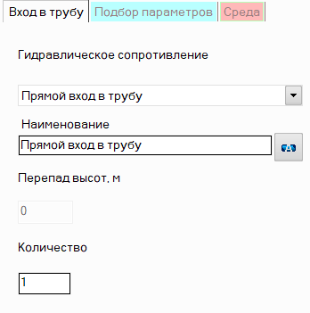 количество - данный параметр для входа в трубу, как правило, не используется. Его используют для других элементов трубопровода (к примеру, для арматуры) при моделировании нескольких одинаковых элементов. В этом случае можно ввести количество данных элементов в это поле и при расчете гидравлические сопротивления и теплопотери на данном элементе будут умножаться на указанную величину. Поскольку в одной ветви трубопровода вряд ли будет несколько входов в трубу, для него данная опция практического интереса не представляет.