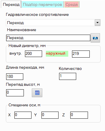 количество - данный параметр для переходов, как правило, не используется. Его используют для других элементов трубопровода (к примеру, для арматуры) при моделировании нескольких одинаковых элементов. В этом случае можно ввести количество данных элементов в это поле и при расчете гидравлические сопротивления и теплопотери на данном элементе будут умножаться на указанную величину. Поскольку в одной ветви трубопровода вряд ли будет несколько одинаковых переходов, для него данная опция практического интереса не представляет;