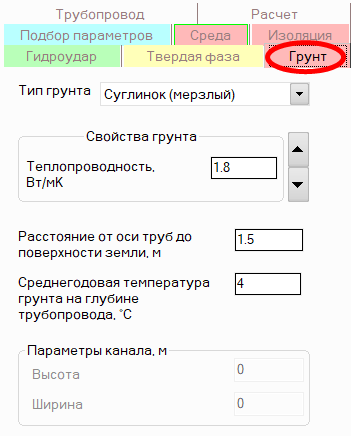 под землей в канале - для трубопроводов, расположенных под землей внутри прямоугольного канала, т.е. теплопередача от трубопровода в окружающий грунт осуществляется через воздушную прослойку канала. Температура и свойства грунта и канала при подземном расположении затем задаются отдельно;