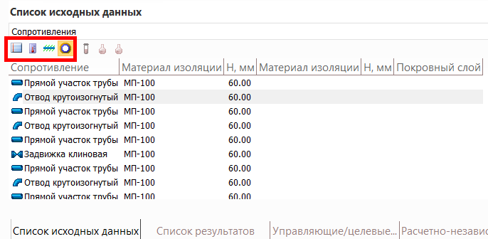 Подсказка: чтобы не запутаться, какие заданы условия расположения, свойства грунтов, параметры теплоизоляции и т.д. у различных элементов трубопровода (ветвей, участков), используйте кнопки-фильтры в верхней части Окна списка исходных данных: