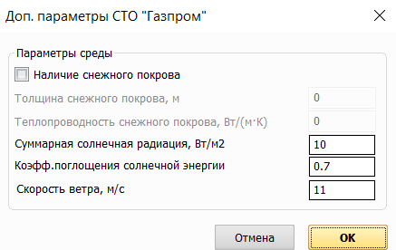 Расчет по СТО Газпром - данная кнопка становится активной, если в настройках расчета трубопровода включена опция "Расчет по СТО "Газпром". При расчете по СТО "Газпром" 2-3.5-051-2006, нажав на данную кнопку, можно включить учет дополнительных факторов теплового взаимодействия трубопровода с окружающей средой, указанных в данном СТО - влияния снежного покрова, солнечной радиации и т.д.: