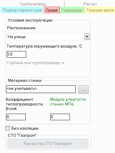 Без изоляции - данная опция служит для отключения учета теплоизоляции при тепловом расчете (к примеру, если вы хотите сравнить работу изолированного и неизолированного трубопровода или если часть трубопровода в изоляции, часть нет и т.д.). Подробнее о задании тепловой изоляции для трубопровода см. ниже.