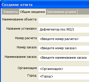 Позволяет задать названия объекта, установки, номер расчета и др. значения, которые могут быть выведены в отчет (См. создание шаблона) |
