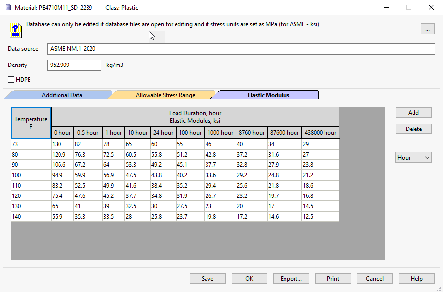The database contains physical properties for pipe and component materials. This database is user-editable.