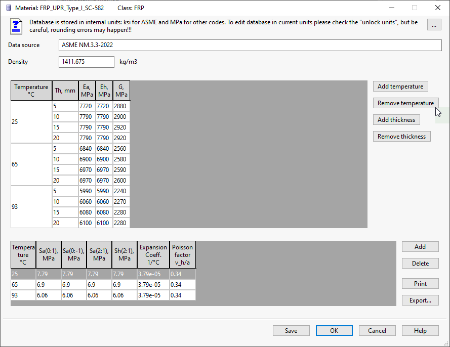 Stresses are stored in internal units (MPa for all codes except ASME, which uses ksi). Editing in other units triggers automatic conversion, which may cause rounding errors. Use ksi for ASME and MPa for other codes to prevent this.