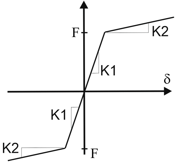 Bilinear restraints require two stiffness values K1, K2 (or flexibilities) and a load F at the transition point between the two linear segments.