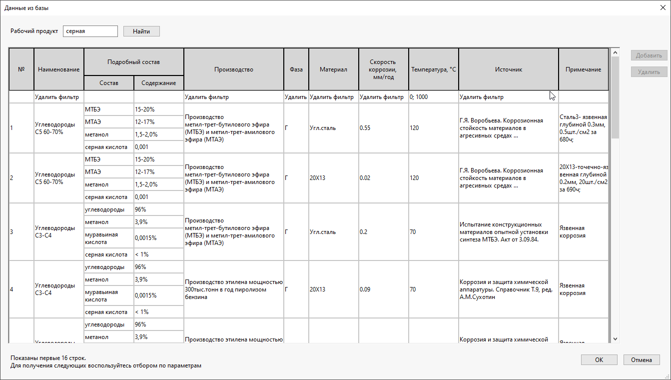 База данных содержит информацию о скорости коррозии различных металлов при различных составах рабочего продукта. Информация взята из различных источников и собрана в единую справочную базу данных. Используется в СТАРТ-Проф для задания прибавки на коррозию и в Старт-Назначенный ресурс.