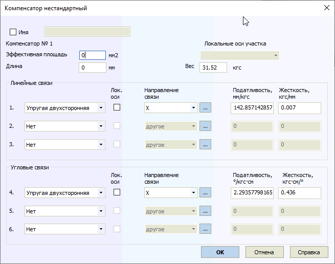По умолчанию, если не задано ни одной связи в нестандартном компенсаторе, считается что торцы труб жестко связаны, то есть присутствуют шесть жестких связей (три линейных и три угловых). Затем устраняются внутренние связи по заданным направлениям и заменяются связями с определенной податливостью.